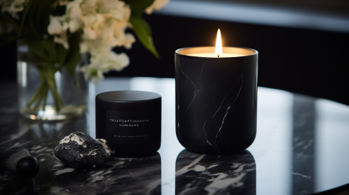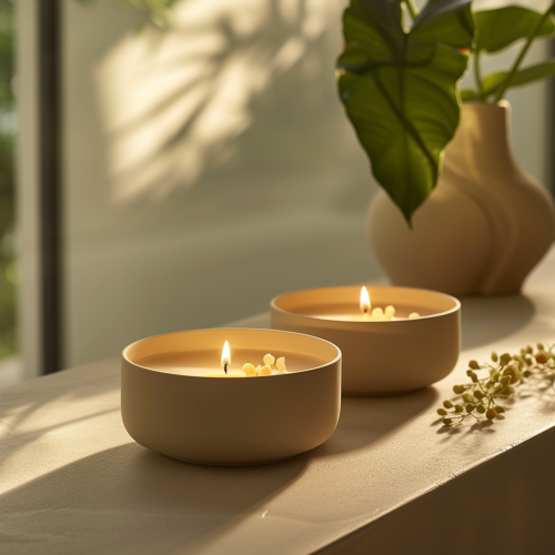 luxury, high end candle collection, that are 3 wick candles that are in Unique Matte Luxury ceramic Candle Jars, shot on sony a7iv, sigma 85mm, f/1.2, sharp focus, shallow depth of field, film grain, vermeer lighting, global illumination style raw --v 6.0 --s 250