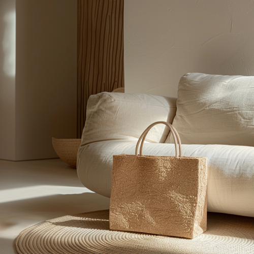 a photo of a paper eco shopping bag from a luxury fashion shop on a boucle cream sofa in an ibiza living room, minimalist, mockup, --v 6.0