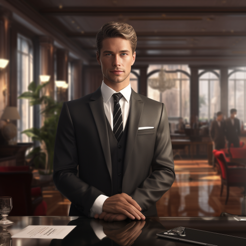 luxury man from germany in a businesssuit standing in front of a table, zoom in, photorealistic