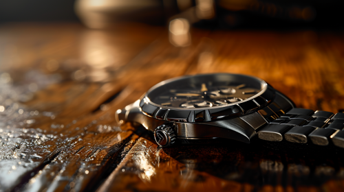 High-end product photography showcasing a luxury watch on a polished wooden table, with subtle reflections and a sophisticated, dark background. Capture intricate details of the watch's design, using macro photography techniques for an elegant, glossy magazine look. --style raw --ar 16:9 --v 6.0