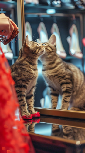 cat wearing fashion clothing and trying on new high heels in front of store mirror. store assistant helping cat decide what high heels to get. very realisitc shot. --ar 9:16 --v 6.0