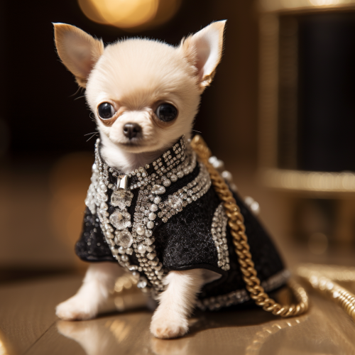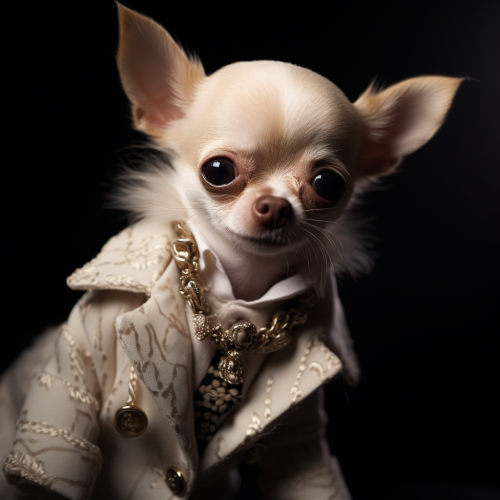 figurino di moda di un chihuahua a figura intera a quattro zampe che indossa un piumino moderno e imbottito con pelliccia