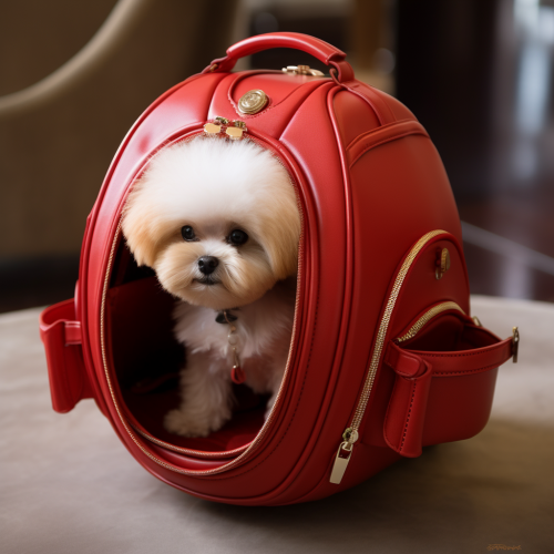 a dog carrier made out of leather that is very elegant and it has a red miniture poodl einside