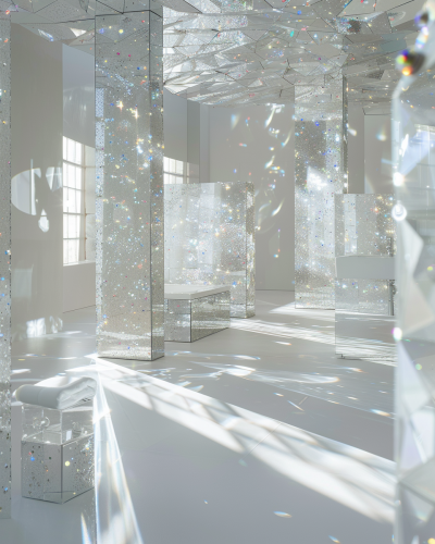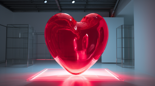 fashion edito glass realistic huge big heart art contemporary installation in the style of jef koons in art gallery. Red light. Light is sharp and contrasted --ar 16:9