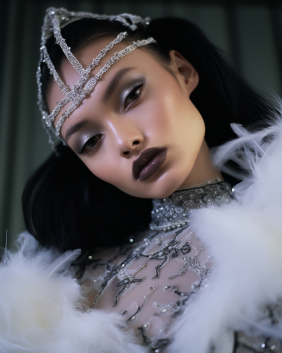 a close up photograph shot of a fashion model light pale asian. she is also dressed in an high fashion way but also in the 80s couture aesthetic. Her face is covered with black pearles of different sizes and glitter. She wears the chantilly lace blouse and lots of feathers. The overall style of the atmosphere is bright, soft and inspired by Style of richard avedon. The photography is striking, very bright, light winter air. Hypermaximalistic, elegant, hyperrealistic, super detailed, ultra crisp andwide Angle Lens, Blinding Light, Soft light, --v 5.2 --ar 4:5