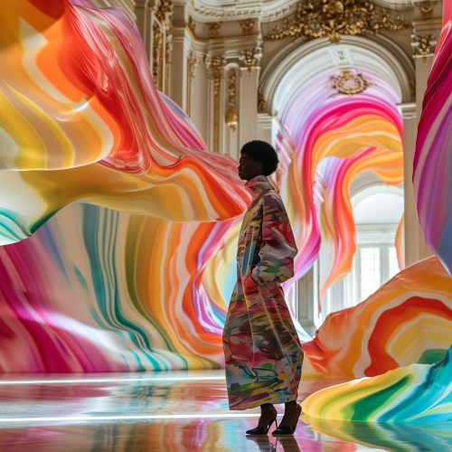 fashion show in inflated 3D psychedelic rococo installation in old palace, model wears yohji yamamoto clothes --v 6.0