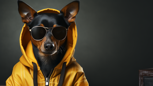 Cool looking Miniature Pinscher wearing funky fashion dress - jacket, tie, glasses. Wide banner with space for text right side. Stylish animal posing as supermodel. --ar 16:9 --s 750