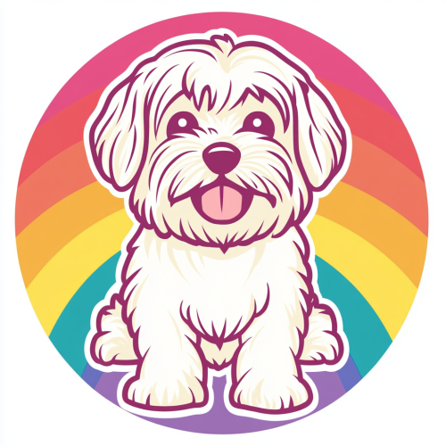 Illustrate a tender, friendly puppy undergoing grooming, with a rainbow arc in the background forming a circle. The style should be bold and graphic, resembling an icon or symbol, with clean lines and a white background. The colors should be vibrant, emphasizing a cheerful and professional tone.