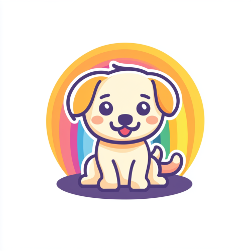 Create an adorable, graphic-style illustration of a puppy getting groomed, with soft, rounded features. The design should resemble an icon or symbol, with a rainbow in a circular shape behind the puppy. The background should be white, giving the logo a clean, modern look. Ensure the illustration is colorful and vibrant, with clear lines and a playful, friendly aesthetic