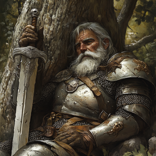 warhammer themed questing knight with battle worn armour and a large two handed sword. he is laying back against a tree. he has no helmet and has a large grey beard.
