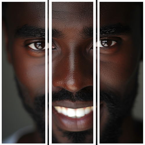 Create an image of a forward facing african american man, beautiful brown eyes, bright white teeth, flawless groomed beard, shiny full lips, posing in a modelesque manner, model pose, love core, triptych photo --v 6.0