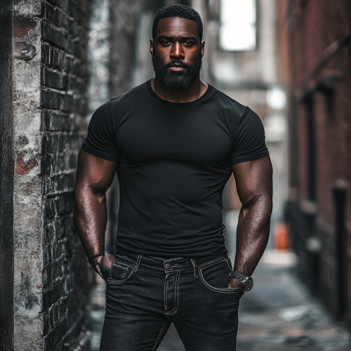 black man. Chocolate/ DARK complexion. Tall athletic build with a close cut, fine silky hair. He has a well-trimmed beard. Wearing all black- jeans and Henley shirt.