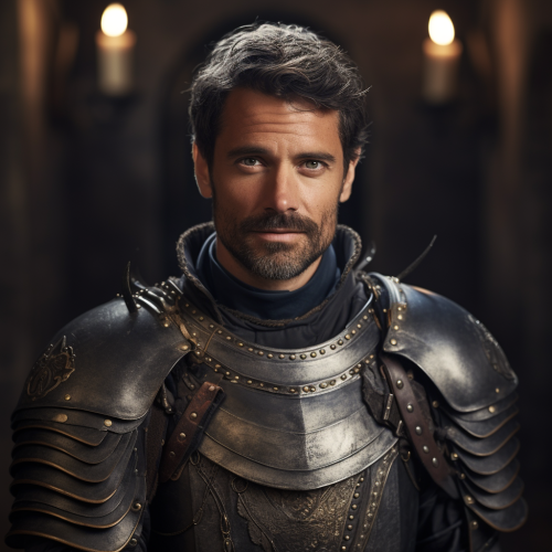 Oil Painting. Style of Max Prentis. Tall. German. Man. Black hair, silvered by age. Blue eyes. Intelligent. Hunter. Master of the Hunt. Royal Court. Groomed Beard. Rugged charm. Noble. 40 years old.