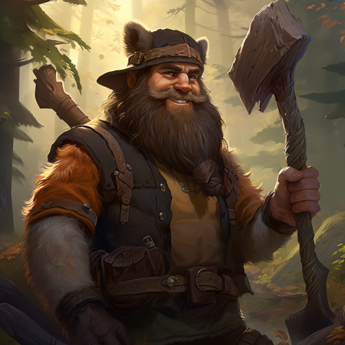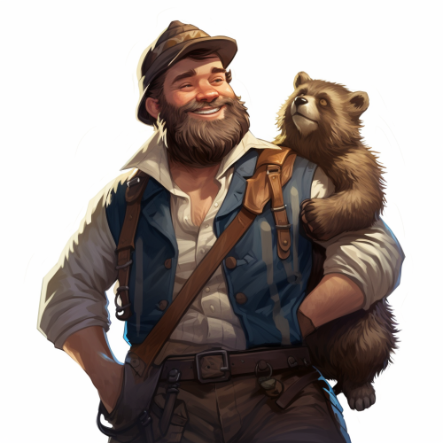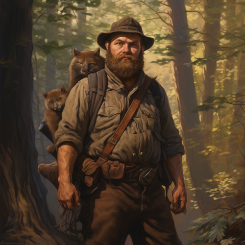 a jolly looking, stocky, handsome, and tall woodsman, with a large well groomed, brown haired beard, he has a racoon skin cap on, and his hands on his hips