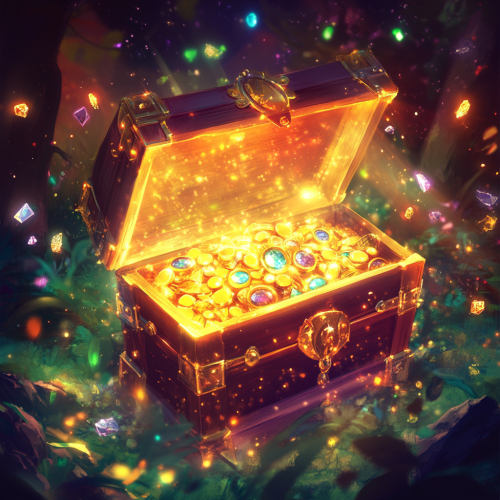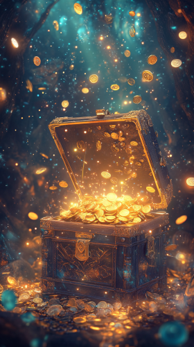 Design a magical, celebratory scene in portrait orientation for a smartphone, in the style of Disney. At the center, a treasure chest is bursting open, with coins, jewels, and magical artifacts spilling out in a radiant cascade. Surrounding the chest, a soft glow lights up the scene, with sparkling confetti and swirls of light dancing in the air. The background is a mystical cavern, its walls adorned with ancient runes that gently glow, contributing to the festive and enchanted atmosphere. --ar 9:16