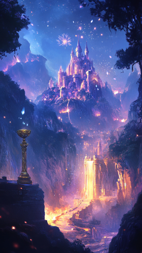 Create an epic, triumphant scene in portrait orientation, inspired by Disney animation. The image should depict a grand landscape with the final destination of the quest, such as a majestic castle, a towering mountain, or a mystical cave, visible in the background. In the foreground, elements like a fluttering victory banner, sparkling fireworks, and a golden trophy on a pedestal should symbolize the successful completion of the quest. The atmosphere is celebratory and magical, with bright, uplifting colors and soft, glowing lights that capture the essence of a Disney triumph. --ar 9:16