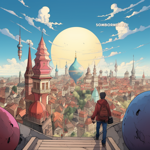 A cartoonish collage-style cover featuring iconic landmarks, with a central image of the protagonist gazing at a world map.