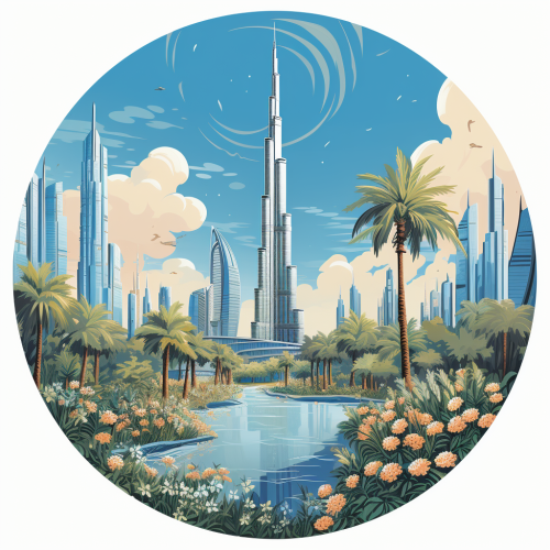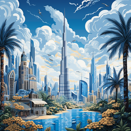 in the whimsical styled Disney illustration iconic burj khalifa sounded by ghaf trees and date palm trees Set in the background of vibrant beautiful blue skies