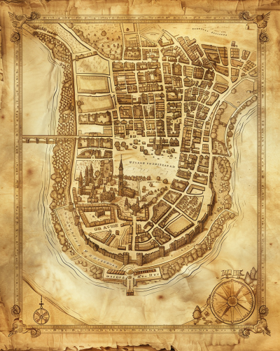 A historical map of an ancient city, with detailed street layouts, city walls, and landmarks. The map is drawn on parchment, with aged and weathered edges, featuring classical cartographic symbols. Sepia tones, warm lighting, subtle shadows. Created Using: hand-drawn illustration, classical cartography style, quill and ink, aged parchment texture, historical accuracy, intricate linework, antique borders, detailed legends, hd quality, natural look --ar 4:5 --v 6.0