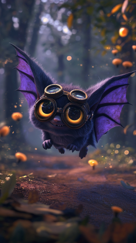 Small cute purple and black Halloween bat with pale yellow eyes, wearing steampunk goggles on its head, flying and flapping down a dirt runway in the middle of an enchanted foggy Forest, lots of dark green evergreen trees with purple magic swirling throughout them, fantastical, tiny orange mushrooms, fantasy style, hyper detailed, 8k --ar 9:16
