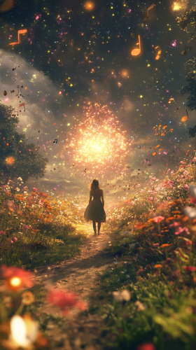 A woman walking down a magical path surrounded by lush grass and vibrant flowers. Ahead of her is a glowing portal, with musical notes and mystical symbols floating around it. The sky is filled with stars and radiant lights, creating a dreamy and mystical atmosphere. The woman is seen from behind, dressed casually, blending naturally into the scene as she walks toward the portal. The overall mood evokes a sense of happiness, miraculous transformation, and the magical power of attraction. --ar 9:16 --v 6.1