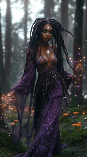 beautiful light skinned African American woman with green eyes and long black dreadlocks, wearing a long purple dress with silver Stars, star makeup and stars surrounding her, steampunk fashion, strutting down a mossy natural runway in the middle of an enchanted foggy Forest, many dark green fir trees, purple magic swirling, tiny orange mushrooms, extremely fantastical, surreal forest, fantasy style, hyper detailed, 8k --ar 9:16