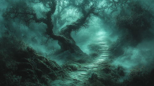 A narrow, winding pathway cuts through an ancient, haunted forest. The trees are tall and twisted, with gnarled branches that resemble clawed hands reaching out. The forest floor is shrouded in thick, creeping fog that glows faintly with an eerie green light. Shadows move unnaturally between the trees, and faint whispers seem to emanate from the darkness. The atmosphere is thick with a sense of dread and foreboding. --ar 16:9 --s 750 --v 6.1