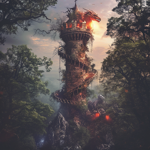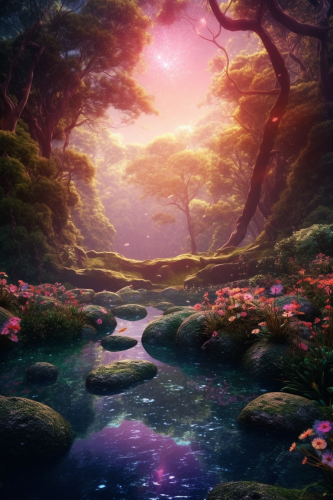 An enchanted pathway in a magical forest, lined with glowing flowers and fireflies, leading to a grand wizard’s tower. The sky filled with swirling stars and nebulas, creating a cosmic backdrop. Vibrant colors with a deep contrast, capturing a sense of wonder and magic. Created Using: Disney fairy tale aesthetic, vibrant lighting, fantasy architecture, painterly textures, soft glow effects, starry sky details, hd quality, natural look --ar 16:9 --v 6.0