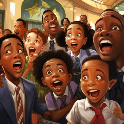 cartoon african-american black children, at school, excited to see a black santa at school, full detail, high resolition, sharp, realistic facial features, 16:9