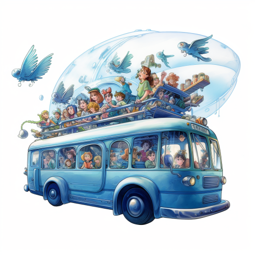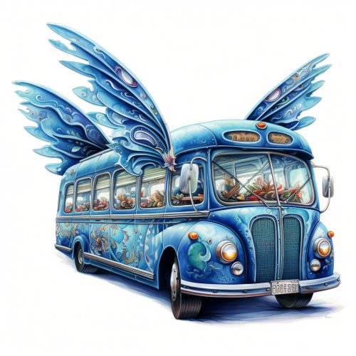 in the whimsical styled Disney illustration a magical small blue bus with wings flying on plain white background