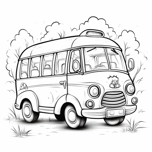 children coloring book, cute, school bus, white background, thick lines, black and white, no shading
