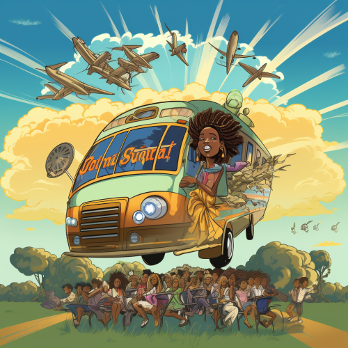 Art Deco style of futuristic school bus driven by a black America middle age woman with dreadlock like Whoopi Goldberg. The bus is filled with children around the age of 7, of diverse entity. Flying off to see the diverse plant habitat around planet earth