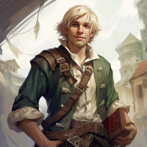 male pirate, blonde hair, short haircut featuring layered fades, cartographer, adventure, researcher, character, D&D, carton, curious and excited