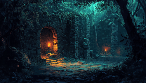 A dimly lit stone hideout deep in the forest The walls are lined with flickering torches,The atmosphere is tense, with shadows dancing on the walls, with cinematic lighting, detailed and intricate illustration in the style of Charlie Bowater, high resolution, The overall aesthetic should be a blend of realism and stylized anime, with vibrant, smooth lighting, and a focus on detailed textures --ar 7:4