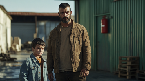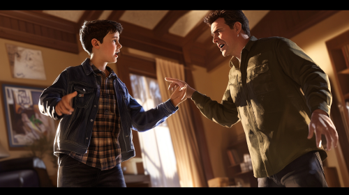A tense confrontation between a boy in his 12 years and a man in his 30s in a cozy, well-lit living room setting. The scene is captured in a hyper realistic style, showcasing intricate details. The boy is wearing a dark denim jacket over a checkered shirt, while the second man is in a olive green shirt and black pant, gesturing expressively. The background features warm, earthy tones with wooden beams and a softly glowing window draped with light curtains. Subtle shadows create depth, emphasizing their intense expressions and body language. The overall atmosphere conveys a mix of emotion and drama, with a focus on the dynamic interaction between the two persons. --ar 16:9
