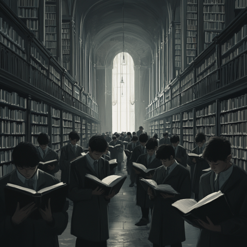 A large, dimly lit library with tall bookshelves, all in muted shades of grey. Rows of students holding grey books stand scattered throughout, their faces expressionless and drained of color. All the students are staring intently at one student, creating an atmosphere of tension and focus. The entire scene is bathed in grey tones, with a somber, muted atmosphere.