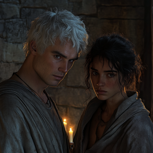 In dim candlelight, a scene captures a tense moment between a man and woman. The man, with white hair and piercing silver eyes, leans slightly forward, exuding confidence and mystery. He wears a simple grey tunic, his expression both calm and knowing. The woman, with dark tousled hair, stands close but guarded, her face a mixture of defiance and yearning. She wears a warm coat over a tunic, her posture tense, as if torn between desire and duty. The atmosphere is intimate, charged, and secretive, with soft shadows dancing along the stone walls behind them.