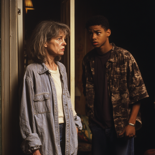 Over-the-shoulder shot,drama, fight, showing only the backs of a white woman in her early 40s and an 18-year-old African American teenager. The woman stands with a slightly slouched posture, her gray-streaked hair loosely tied, wearing simple, worn-out clothes. The young man, in oversized, casual '90s attire, slams the door in frustration. The scene is set in 1992, with a dimly lit, modest home interior and decor reflecting the era. The lighting and angle emphasize the tension between them.