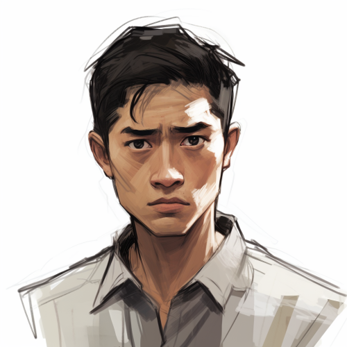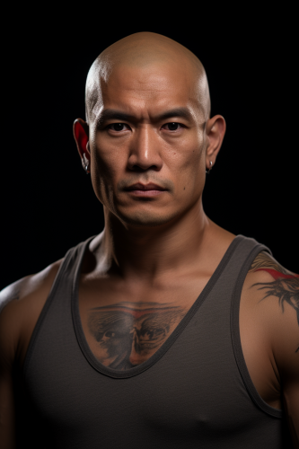 a filipino muscular man wearing tank top, side-view, with a shaved head and a scar across his cheek, mood is tense, sony alpha a1, studio portrait, performance --ar 2:3