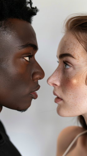Classic portrait of a black young man facing a white brunette young woman with natural lighting, capturing subtle facial expressions and fine details in the skin texture --v 6.0 --stylize 80 --style raw --ar 9:16