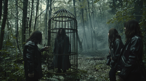 a man in a read cultist robe is trapped in a metal cage and women with leather jackets are jeering and teasing him from outside the cage, in the middle of a forest, cinematic --ar 16:9