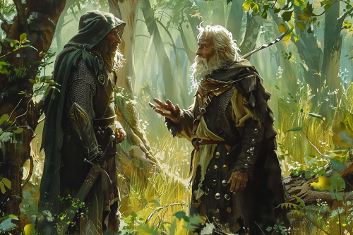 a half elf paladin argues with an old homeless man wearing chain mail, set in a forest glade --ar 3:2
