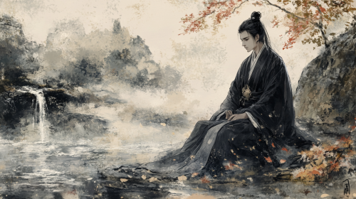 In a serene, traditional Japanese setting inspired by the Heian period, a man dressed in elegant robes is depicted alone, lost in thought. His emotions are in turmoil, symbolized by the wind gently stirring the leaves and the flowing stream nearby. The atmosphere is calm yet tense, reflecting his deep, unspoken love. The scene captures his inner conflict, as he wonders if the woman he loves could ever sense his feelings without anyone telling her. The landscape is peaceful, with soft light and delicate details, but the man’s expression reveals his quiet anguish --ar 16:9