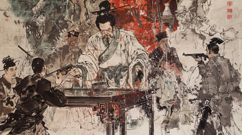 A man holds a pistol against the seated emperor in the Chinese imperial palace, Chinese ink painting, while soldiers around him are holding knives and dare not move forward.--v 6 --ar 16:9