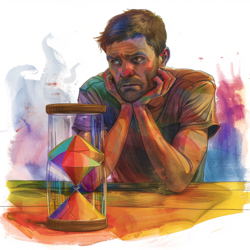 a man looking at a colorful sandwatch. Sweating, looking tensed.