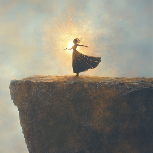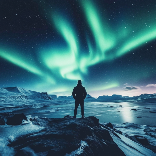 Um homem de pé em um penhasco ou montanha, olhando para um horizonte vasto e iluminado por uma aurora boreal. Ele é envolto por um campo de energia azul e verde que flui em torno dele, conectando-se com as estrelas e galáxias à distância. O ambiente deve transmitir força, determinação e uma conexão profunda com o universo.