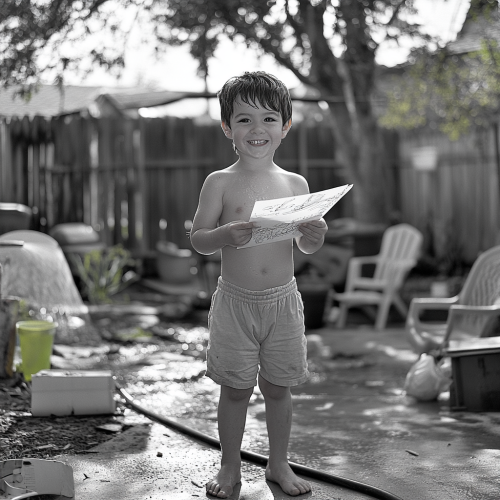 Amid the chaos of the backyard--overturned chairs, scattered toys, and a hose spraying water--the boy stands still, gripping a paper in one hand and a pen in the other. He’s beaming with pure, unfiltered joy, his wide smile lighting up his face. Yet, beneath that happiness, there’s a subtle, almost unspoken need in his eyes. His gaze is fixed on me, as if he’s eagerly awaiting approval or permission. His smile is genuine, but there’s a flicker of anticipation, like he wants me to notice something or say the right thing. The way he clutches the paper and pen suggests he’s excited about something he’s drawn or written, but unsure if it’s enough or if he’ll get the response he’s hoping for.