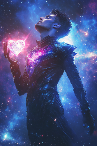 Illustration, handsome androgynous young man with futuristic clothes and crystal heart, galaxy background, divinity, fantasy, realistic, fantastic, dynamic pose, extremely detailed and complex, elegant, --ar 2:3