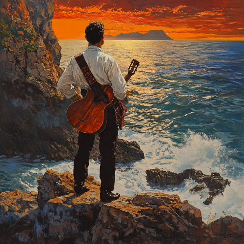 A man seen from behind, wearing a traditional flamenco outfit, standing on a rocky cliff overlooking the sea. He holds a guitar slung over his shoulder, ready to play. The scene is dramatic with the ocean waves crashing against the rocks, the sky is a deep orange with the sun setting on the horizon, casting long shadows. The man’s posture is strong and passionate, embodying the spirit of flamenco.