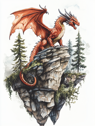 illustration for fantasy card game, red furious dragon, standing on the rocky cliff with few pine trees, roarin, action pose, digital painting --ar 3:4